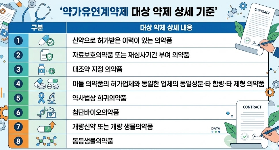 또 ▲약사법상 희귀의약품 ▲첨단바이오의약품 ▲개량신약 또는 개량 생물의약품 ▲동등생물의약품이 해당된다. 위험분담제가 부과된 약제는 제외했다.