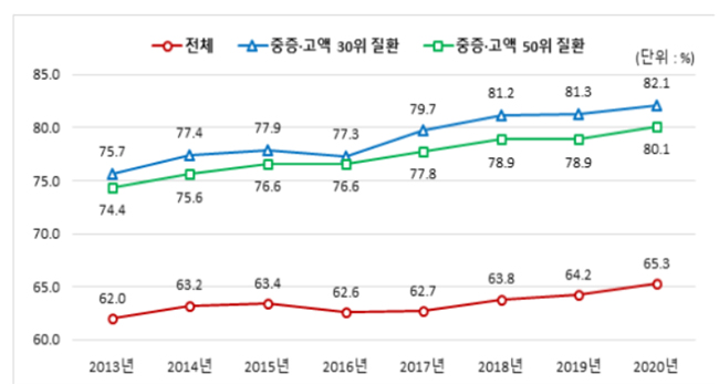 2020년도 1인당 중증 고액진료비 상위 30위 내 질환(백혈병, 림프암, 췌장암 등)의 보장률은 2017년 대비 2.4%p 증가한 82.1%, 상위 50위 내 질환(30위 내 질환, 치매, 패혈증, 호흡기 결핵 등)의 보장률은 2017년 대비 2.3%p 증가한 80.1%로 나타났다.