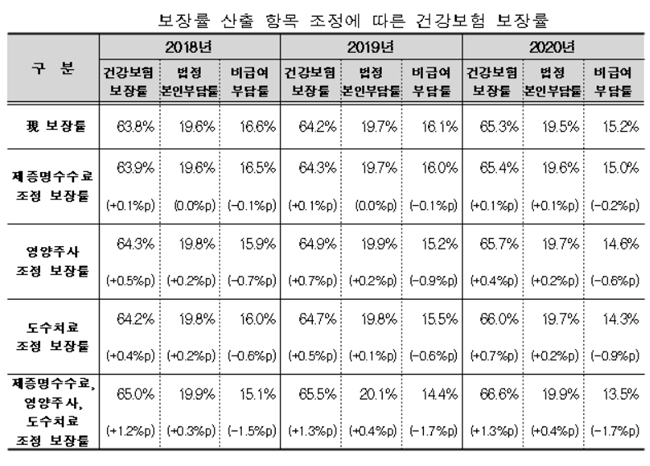보장률에 포함되는 항목 중 제증명수수료, 영양주사, 도수치료 비용을 제외하고 치료적 필수성이 높은 항목 중심의 보장률을 산출한 결과 현 건강보험 보장률보다 1.3%p 높은 66.6%을 보였다.