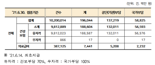 건강보험공단이 최근 집계한 '요양급여비 및 코로나19 치료비용 지출 경과'를 보면 올해 6월 30일 기준 1020만14명에게 백신접종이 이뤄졌고, 전체 1960억원의 시행비가 들었다.