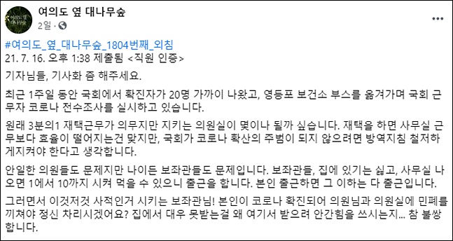국회 사무처 직원과 의원실 보좌진, 정당 관계자가 모인 익명 게시판 '여의도 옆 대나무숲'에는 방역지침을 제대로 지키지 않는 의원실을 향한 불만 섞인 비판이 나오는 실정이다.