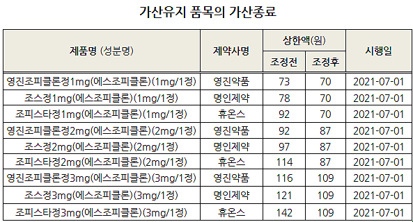 품목별 인하율을 살펴보면 휴온스 조피스타정1mg과 2mg, 3mg이 각각 23.9%, 23.7%, 23.2%씩 떨어진다. 영진약품 영진조피클론정1mg은 4.1%, 2mg은 5.4%, 3mg은 6% 떨어진다. 명인제약 조스정1mg과 2mg 함량 제품은 각각 10.3%, 3mg 함량은 9.9% 인하된다.