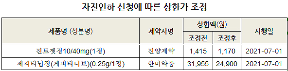 ◆자진인하 신청에 따른 상한가 조정 = 정부는 업체가 기등재된 약제 상한가보다 낮은 금액으로 상한가 인하를 신청한 경우 신청금액으로 약가를 다시 산정하고 있다.