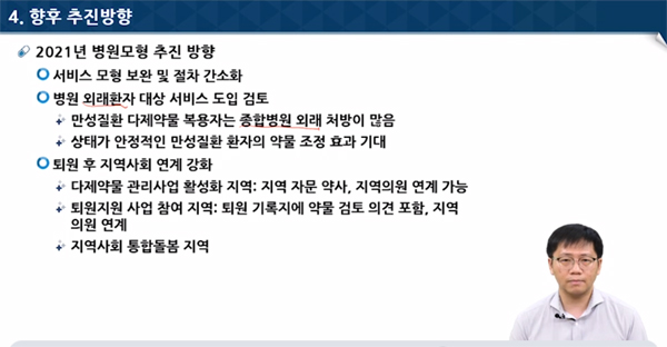 한주성 과장은 "올해 역시 입원 시 지참약 및 약력 검토, 퇴원 시 퇴원약 검토, 의사 처방조정과 외래 환자 대상 포괄적 약력 검토 및 처방 조정이 이뤄질 수 있을 것"이라며 "특히 지역 의원, 약사와 연계할 수 있는 구체적인 서비스 모형을 개발 중"이라고 소개했다.