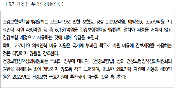 내용에 따르면, 앞으로 국회와 정부가 국민건강보험법 상 건강보험 요양급여에 관한 위원회의 권한이 충분히 발휘될 수 있도록 적극 노력할 것, 최소한 의료인력 지원에 사용될 480억원은 2022년도 건강보험 국고 지원에 추가 반영할 것을 촉구하는 부대의견을 덧붙여 의결했다.