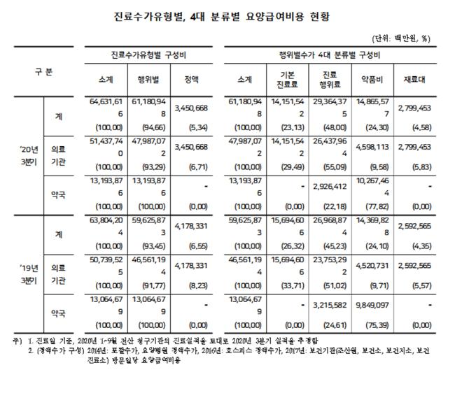 지난해 3분기 진료수가유형별 요양급여비용은 행위별수가 94.66%, 정액수가 5.34%로 구성됐고, 3분기 행위별수가의 4대 분류별 구성비는 기본진료료 23.13%, 진료행위료 48.00%, 약품비 24.30%, 재료대 4.58% 차지했다.