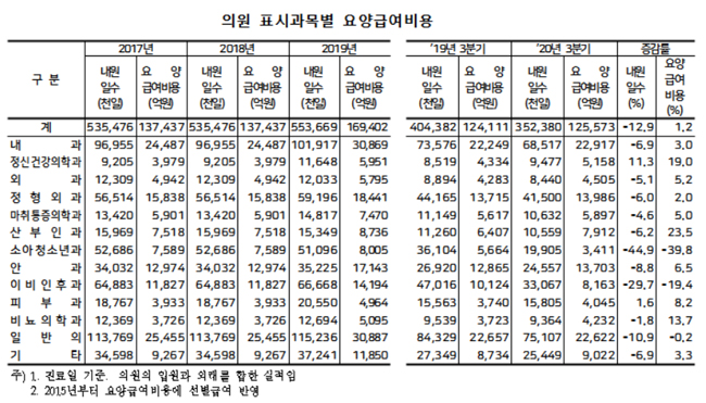 우선 지난해 3분기 요양급여비용 중 입원 요양급여비용은 24조6496억원으로 전년 동기 대비 2.79% 증가, 외래 요양급여비용은 26조7881억원으로 전년 동기 대비 0.11% 증가했다.