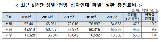 건강보험공단(이사장 김용익)은 건강보험 진료데이터를 활용해 2015년부터 2019년까지 최근 5년 간 전방 십자인대 파열 질환의 건강보험 진료현황을 발표했다.