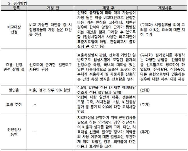 개정 항목은 ▲내용 변경 (분석관점, 할인율) ▲내용 구체화 (분석기간, 분석기법, 분석대상 인구집단, 비교대상 선정, 비용, 모형구축 등) ▲내용 신설 (간접비교, 자료의 통계적 분석, 진단검사를 동반한 의약품에 대한 지침) ▲내용 삭제 (재정영향분석)로 이뤄졌다.