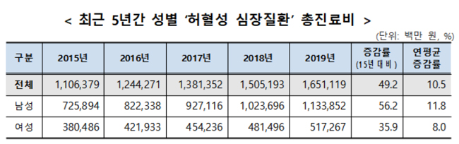 [데일리팜=이혜경 기자] 허혈성 심장질환자가 2015년 80만4000명에서 2019년 94만2000명으로 17% 이상 증가했다.