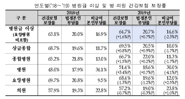 의원의 보장률은 통증·영양주사 등 주사료, 재활·물리치료료 등 비급여 증가로 보장률이 하락하고, 요양병원은 투약 및 조제료, 주사료, 재활 및 물리치료 등 비급여 증가로 보장률이 떨어졌다.
