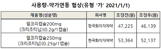 한국화이자제약 잴코리(크리조티닙)는 많이 팔려 사용량-약가연동협상 유형에 포함돼 함량별로 각각 2.3%씩 인하된다.