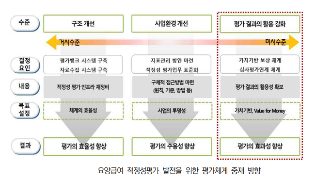 적극적인 질 개선 유도를 위해 의료 질과 진료성과를 반영할 수 있도록 질 지표 개발 연구를 선행함으로써 지표의 신뢰성 및 타당성 확보하고, 목표중심 평가와 상호보완적으로 작동할 수 있는 근거를 확보한다는 의견을 덧붙였다.