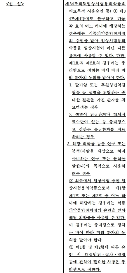 실제 식약처는 정식 법제화에 앞서 인도주의적 차원에서 지난 5월부터 희귀·난치질환자가 해외 임상시험용약을 쓸 수 있도록 절차를 마련해 운영중이다.