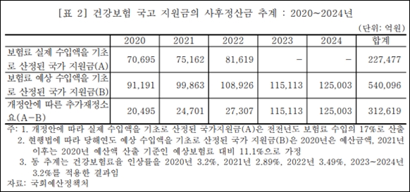 건보법 개정안 추계 내역을 살피면 건보 정부지원금 산출 기준을 상향하고 한시적 지원 규정을 삭제하면서 늘어나는 재정소요액을 따졌다.