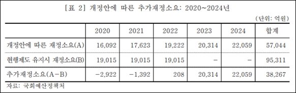 결과는 올해 -2922억원, 2024년 2조2059억원 등 5년간 총 3조8367억원으로 추계됐다.
