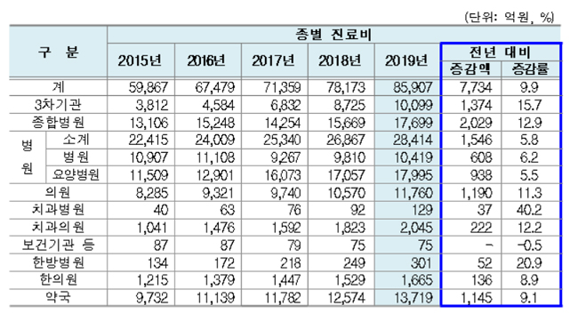 행위별수가는 7조5276억원으로 전년 대비 10.8%(7319억 원) 증가했고 정액수가는 1조631억원으로 전년 대비 4.1%(414억원) 늘었다.