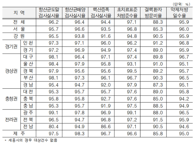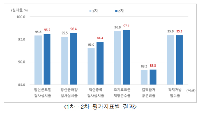 결핵 진단 후 결핵 치료 원칙에 따른 표준처방 준수 여부를 평가하기 위한 것으로 1차 평가 대비 초치료 표준처방 준수율은 0.3%p(96.8 → 97.1%) 늘었다.