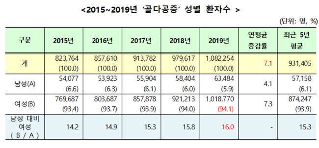 골다공증으로 진료를 받은 건강보험 환자수는 2015년 82만명에서 2019년 108만명으로 연평균 7.1% 증가했다. 지난해 기준만 보면 여성환자가 전체의 94%를 차지했다.