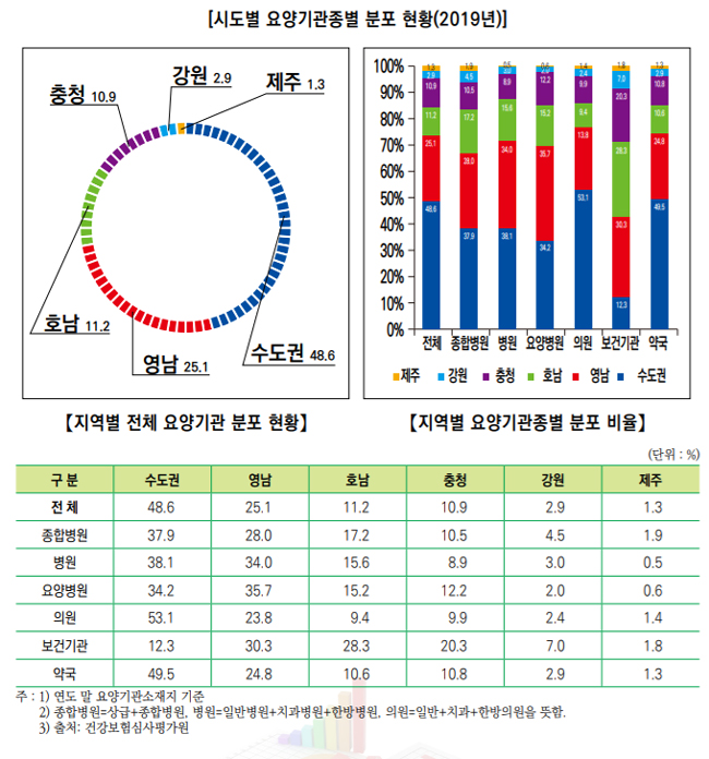 약국수는 2018년 2만2082개소에서 1.9% 늘어난 2만2493개소로 49.5%가 수도권에 자리했다. 이어 영남지역 24.8%, 충청지역 10.8%, 호남지역 10.6%, 강원지역 2.9%, 제주지역 1.3% 순으로 약국이 분포했다.