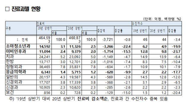 진료과별 현황을 살펴보면, 올해 상반기 진료비의 경우 전년동기 대비 소아청소년과 3266억원, 이비인후과 1714억원, 응급의학과 628억원 감소하는 등 진료비 감소폭이 상대적으로 큰 것으로 나타났다.