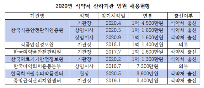 산하 기관 임직원 29명 채용 중 20명 식약처 출신