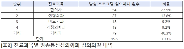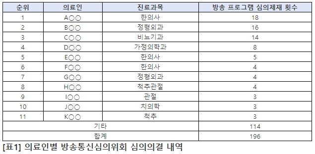 특히 담적병을 주제로 출연해 병원의 명칭을 반복적으로 고지한 한의사는 18회, 프롤로치료의 효능 효과를 과도하게 언급하며 전화상담을 홍보한 정형외과 의사는 16회, 발기부전 시술 관련 효능 효과를 과장하거나 보증하고 병원 명칭을 홍보한 비뇨기과 의사는 14회, 홈쇼핑에 출연하여 자가 개발한 유산균의 기능성을 보증하거나 추천한 가정의학과 의사는 8회 등의 제재를 받았다.