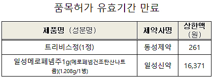 동성제약 트리비스정과 일성신약 일성메로페넴주1g은 품목허가 유효기간이 만료, 업체가 갱신하지 않으면서 급여목록에서도 자동으로 빠진다.