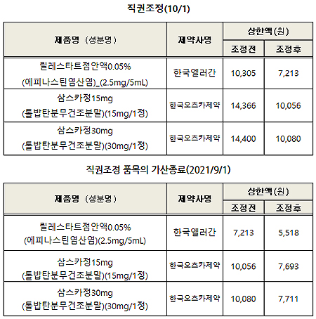 한국앨러간 릴레스타트점안액0.05%(에피나스틴염산염)과 한국오츠카제약 삼스카정(톨밥탄분무건조분말)은 내달 직권조정 30% 인하에 1년 후 가산이 종료되면서 추가로 23.5%가 더 떨어진다.