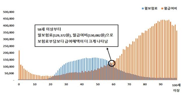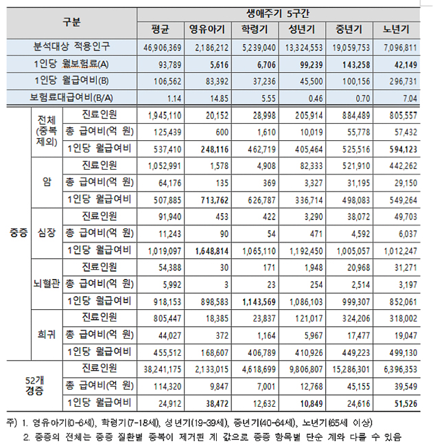 영유아기는 1인당 월평균 1255원의 보험료를 부담하고 8만3930원의 급여를 제공받아 생애주기 구간에서 가장 높은 66.9배의 혜택을 받았고, 성년기에서는 10만9127원을 부담하고, 4만4638원을 급여비로 받아 가장 낮은 0.41배의 급여혜택을 받았다.