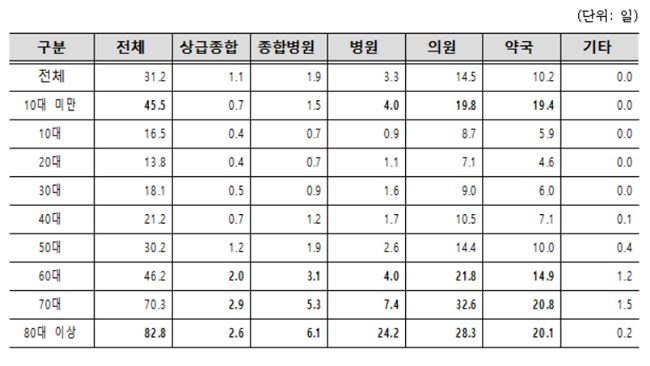 전체 연령대별 1인당 연간 의료이용일수는 전체 평균 31.2일인데 반해 80대 이상에서 82.8일로 가장 높았고, 10대 미만에서도 45.5일로 뒤를 이었다.