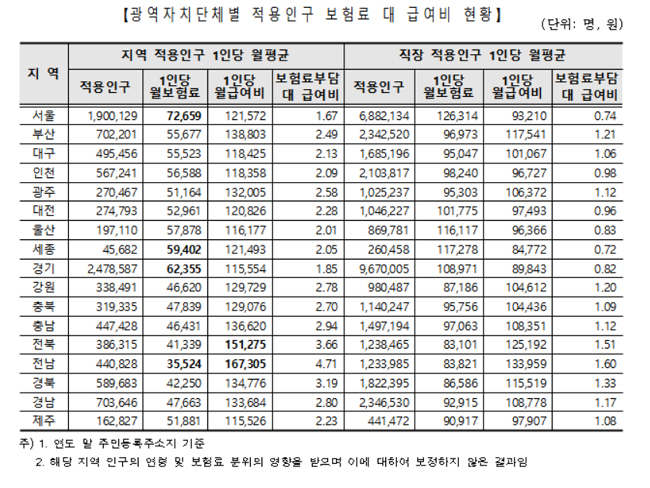 - 보험료 서울이 가장 많이 내고, 혜택은 전남이 가장 많이 받아