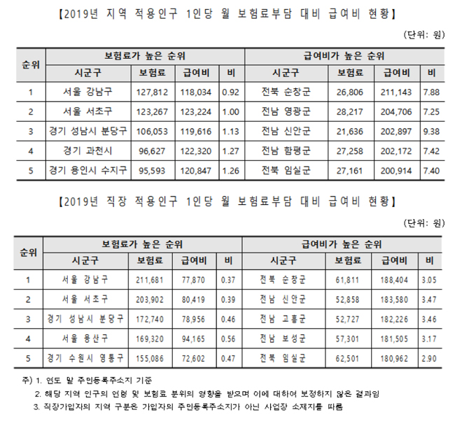 기초자치단체별로 세분화 하면 지역 적용인구에서 1인당 월평균 보험료가 가장 높은 곳은 서울 강남구(12만7812원)이었으며, 서울 서초구(123,267원), 경기 성남시 분당구(106,053원) 등이 뒤를 이었다.