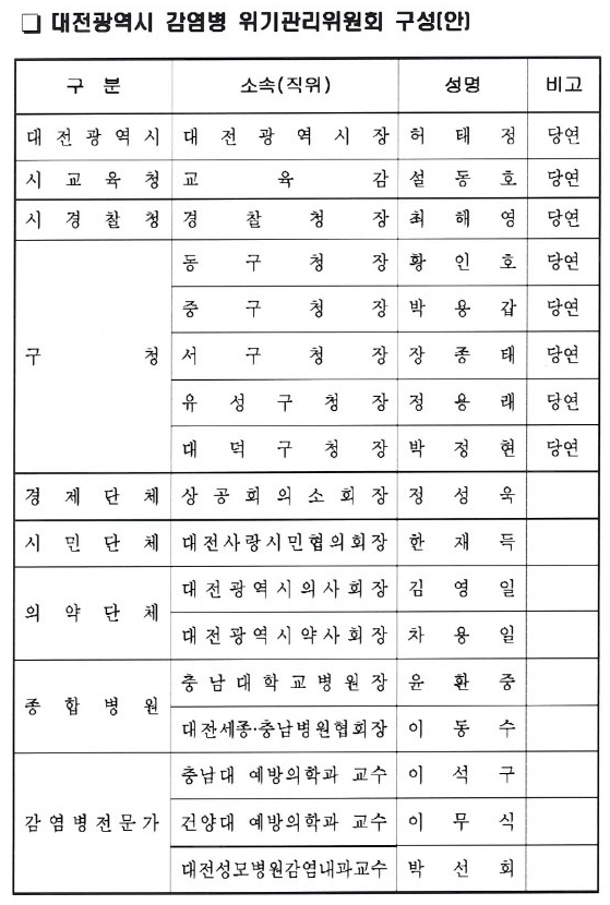 감염병관리위는 허태정 대전시장, 설동호 대전교육청 교육감, 최해영 대전경찰정장과 5개 구청장 등 당연직을 토대로 경제단체·시민단체·의약단체·종합병원·감염병전문가로 구성된다.
