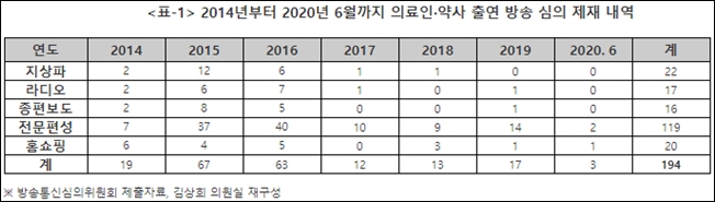 실제 방심위가 김 부의장에 제출한 자료에 따르면 2014년부터 2020년 6월까지 의료인과 약사가 방송이나 홈쇼핑에서 잘못된 의료정보를 제공하거나 허위·과대광고, 병원 홍보 등으로 방송심의 제재를 받은 사례가 총 194건으로 집계됐다.