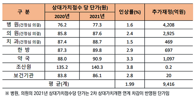 병원과 의원, 치과는 건보공단과 수가협상 결렬로 보건복지부 건강보험정책심의위원회에서 각각 1.6%, 2.4%, 1.5%의 수가인상률이 확정됐다. 병원과 의원은 2021년 상대가치점수 당 단가에 2차 상대가치개편 연계 차감 결과가 반영됐다.