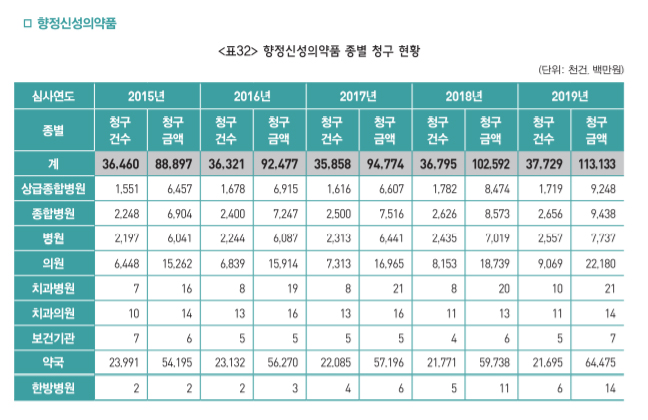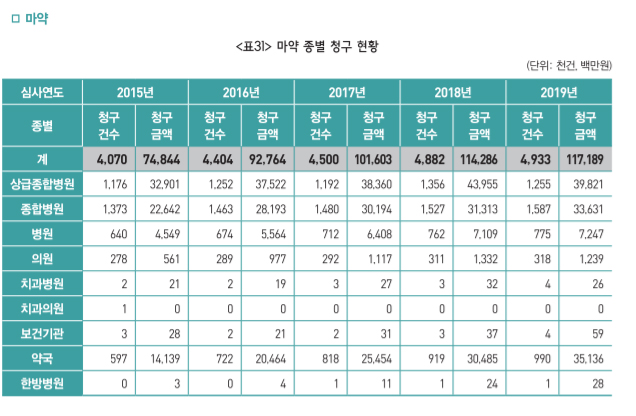 청구금액을 보면 전체 종별에서 1171억8900만원 어치의 마약과 1131억3300만원 어치의 향정약이 쓰였다. 약국에선 각각 351억3600만원, 644억7500만원을 청구했다.