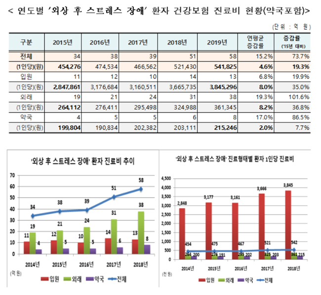 [데일리팜=이혜경 기자] 지난해 외상 후 스트레스 장애로 의료기관을 내원한 환자가 1만명을 넘었다. 최근 5년 동안 45.4% 증가한 셈인데, 20대 여성 환자는 2015년 720명에서 지난해 1493명으로 2.1배 늘었다.