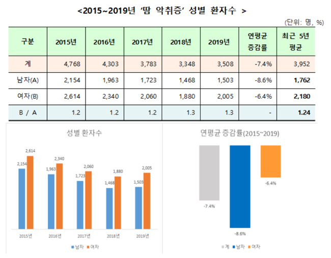 성별로는 2015~2019년까지 평균 남자 환자는 1762명(44.6%), 여자 환자는 2180명(55.4%)으로 여자 환자가 약 1.24배 많았다.