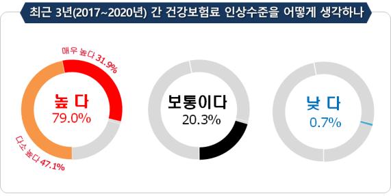 그 결과 문케어 시행 이후 최근 3년(2018~2020)간 보험료율 누적인상률(9%)에 대해 매우 높다(31.9%)와 다소 높다(47.1%) 등 전체 응답자의 79.0%가 높다는 반응을 보였다.