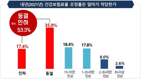 내년도 건강보험료율의 적정 조정률(구간)을 조사한 결과, 전체 응답자 중 가장 많은 35.9%가 동결을 요구한 가운데, 인하를 요구한 응답자도 17.4%에 이르렀다.