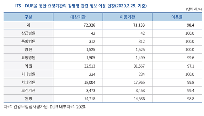 건강보험심사평가원은 감염병이 발현되지 않은 평상시에도 DUR·ITS를 사용할 수 있도록 미 이용기관에 대한 관리가 지속적으로 필요하다는 입장이다.