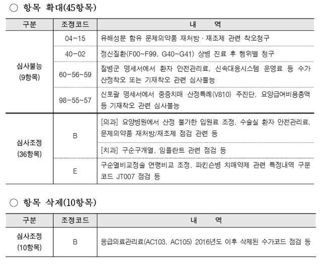 이 밖에 심사조정 항목은 36개가 신설됐는데, 요양병원에서 산정 불가한 입원료 조정, 수술실 환자 안전관리료, 문제의약품 재처방·재조제 점검 관련이 'B코드'로, 순구개열, 임플란트 관련 점검 관련이 'E코드'로 심사조정 항목에 포함됐다.
