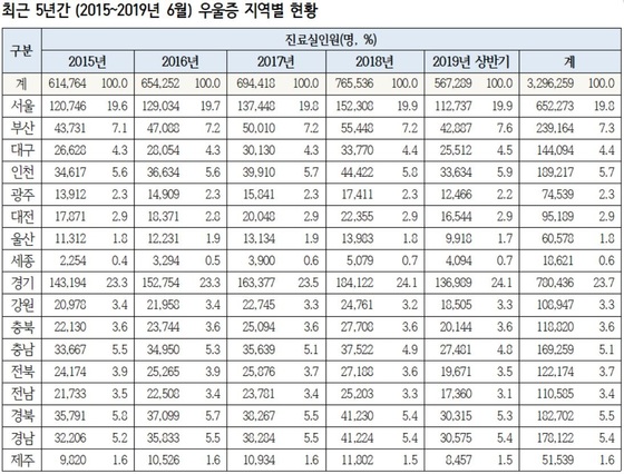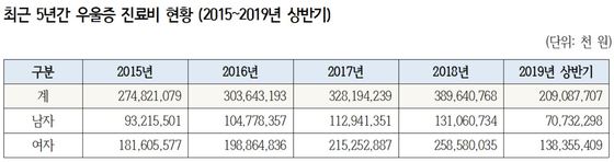 1일 국회 보건복지위원회 기동민 의원(더불어민주당)이 국민건강보험공단으로부터 받은 '2015∼2019년 상반기 우울증 진료 현황'에 따르면 지난해 우울증 진료비는 3896억원이었다.