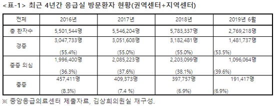 4년간 응급실 방문환자수는 2016년 550만명, 2017년 554만명, 2018년 578만명, 2019년 상반기 276만명으로 지속 증가추세다.