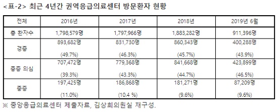응급실을 이용해야 할 중증환자의 경우에도 2016년 8.3%, 2017년 7.4%, 2018년 6.9%, 2019년 상반기 6.9%로 지속 감소추세였다.
