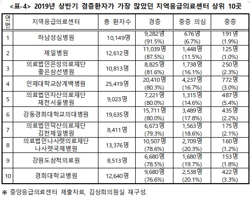 2019년 상반기에 경증환자가 가장 많았던 지역응급의료센터 상위 10곳을 살펴본 결과, 하남성심병원은 총 1만149명의 환자가 응급실을 방문했는데 이 중 9282명인 91.5%가 경증환자였다.