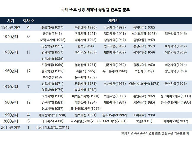 60년대에는 부광약품, 광동제약, 녹십자, 동국제약 등이, 70년대에는 신일제약, 한미약품, 경동제약 등 7개 제약사가, 80년대에는 명문제약, 동구바이오제약, 경보제약 등 12개 제약사가 설립됐다.