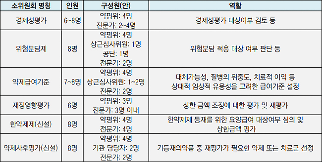 전체 6개 소위에는 약평위 위원 4명이 고정적으로 참여하게 되는데, 심평원은 약평위 의결을 거쳐 약평위와 소위원회 효율적 연계를 위해 약평위 위원을 50% 이상 선정하도록 했다.