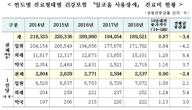 알코올 사용장애 질환의 입원 환자수는 2014년 3만1000여명에서 2018년 2만4000여명으로 7000여명이 감소해 연평균 감소율 6.1%를 기록했다.